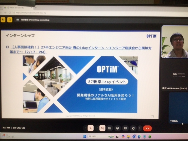 企業説明会では、(株)オプティム佐賀本店オフィス長の村井慶史様をオンラインでお招きし、IT業界の最先端について御紹介いただきました。